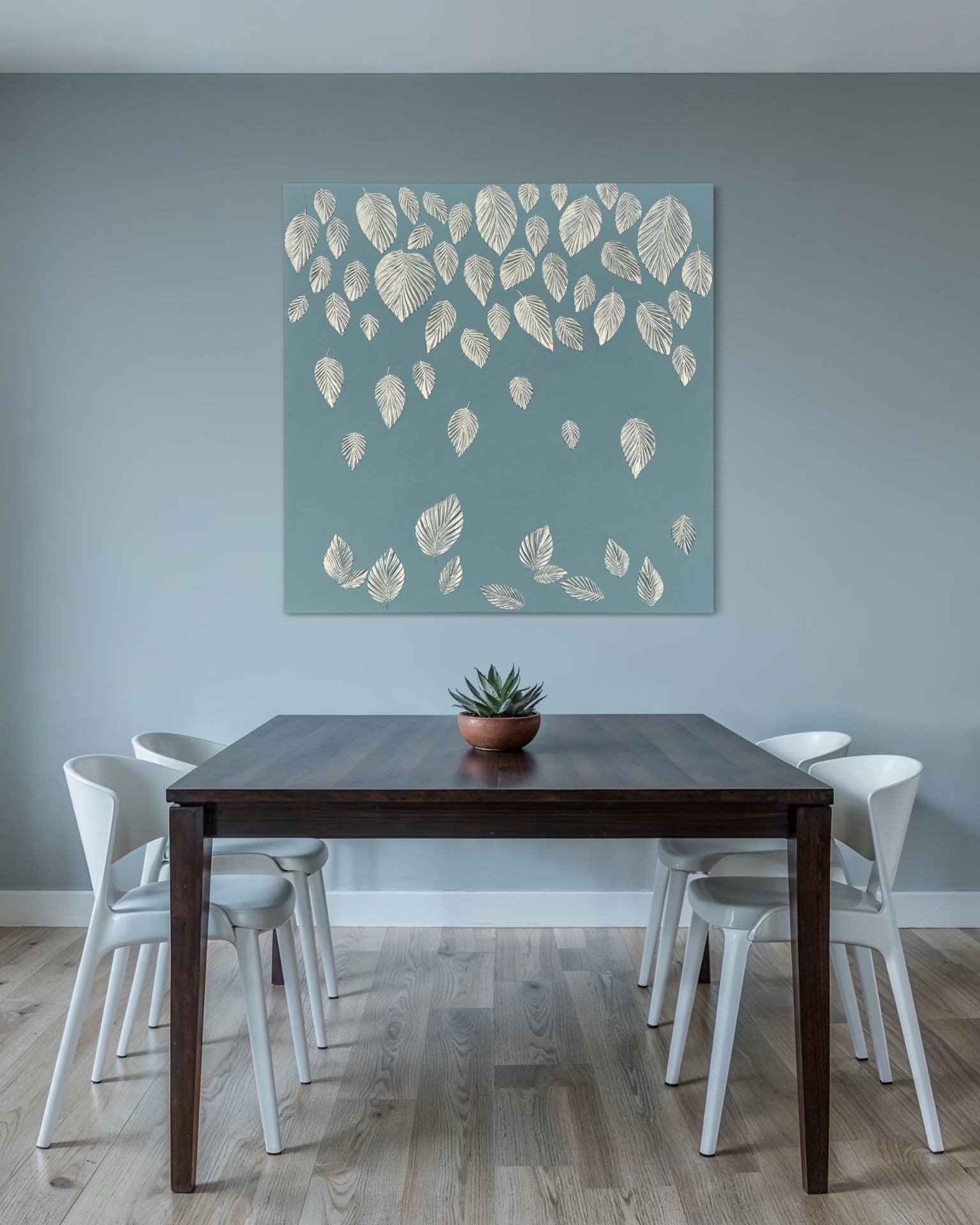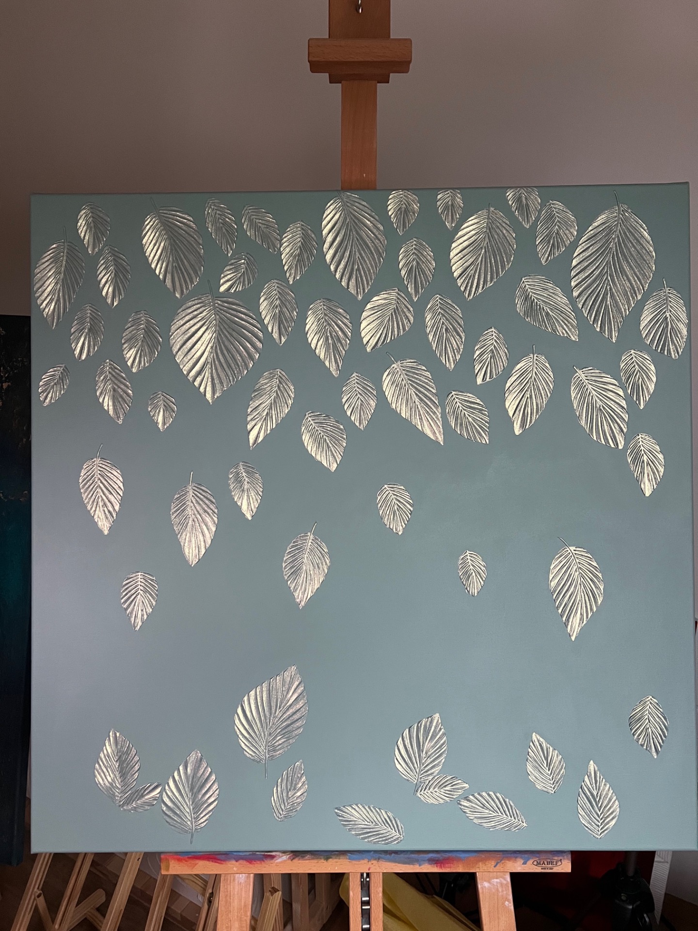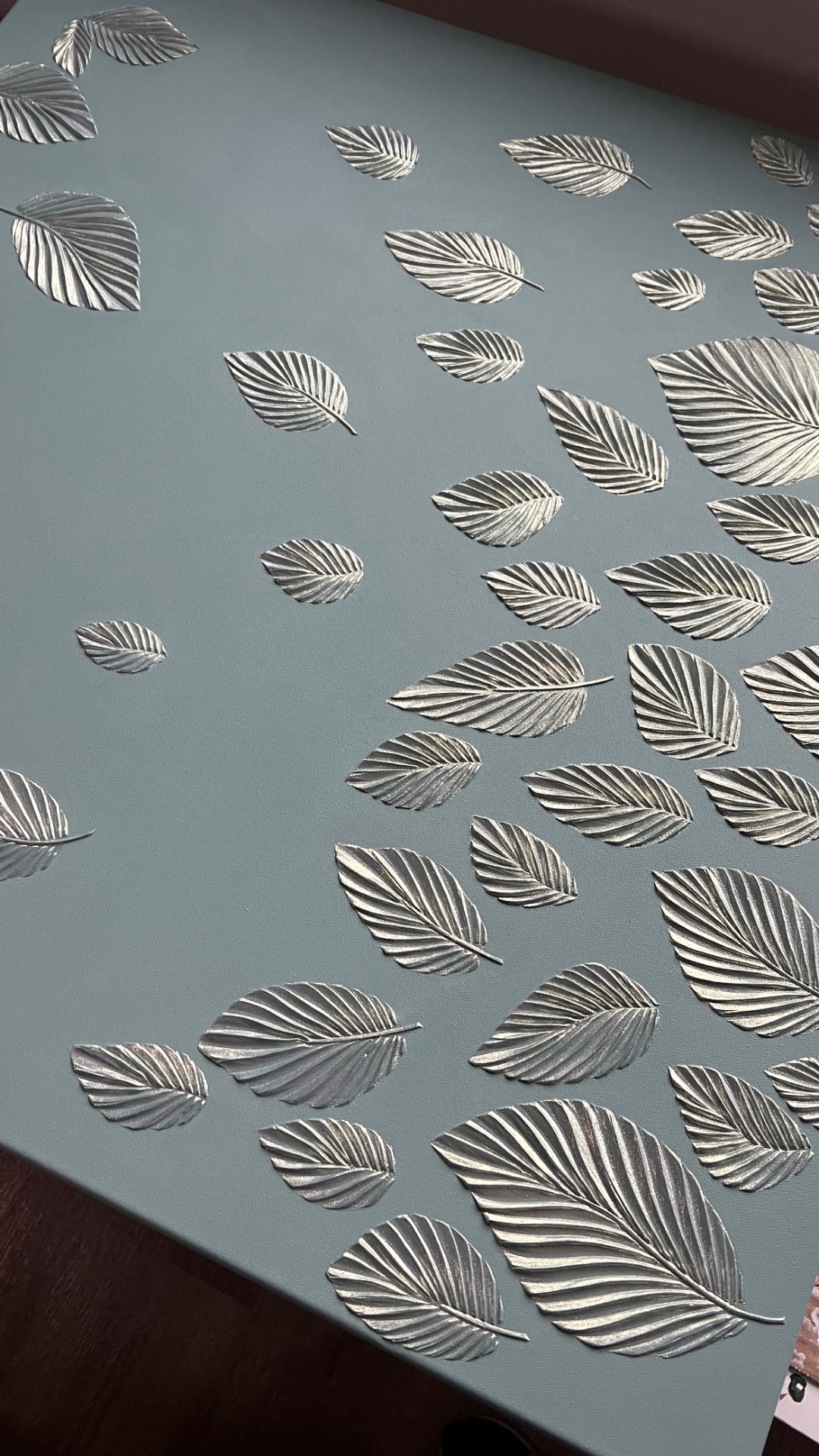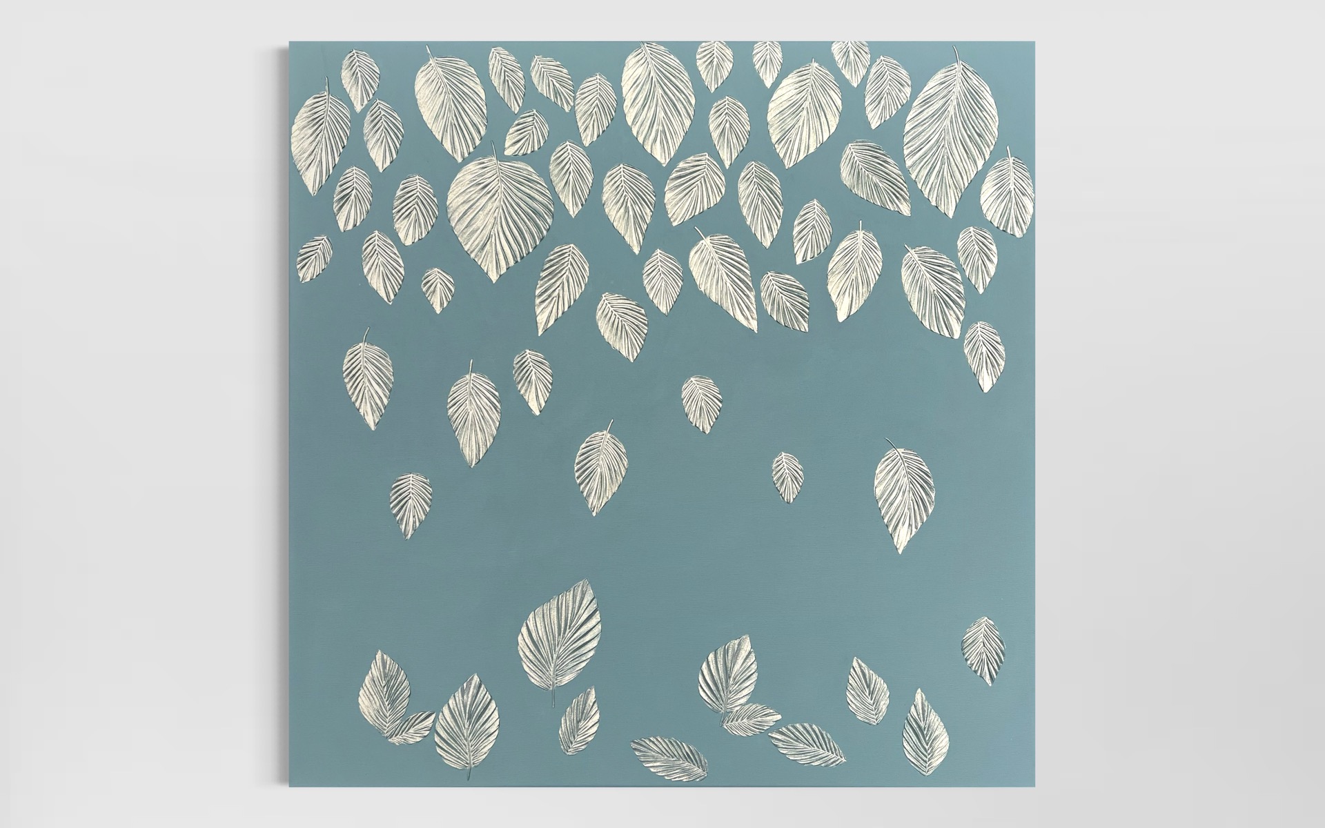 Falling Leaves – jemné a elegantní dílo vytvořené pomocí strukturovací pasty a akrylu na plátně. Reliéfní listy působí, jako by se tiše snášely vzduchem, a přinášejí do prostoru pocit klidu, lehkosti a přirozeného pohybu. Minimalistický design dodá interiéru harmonii a nadčasovou eleganci.