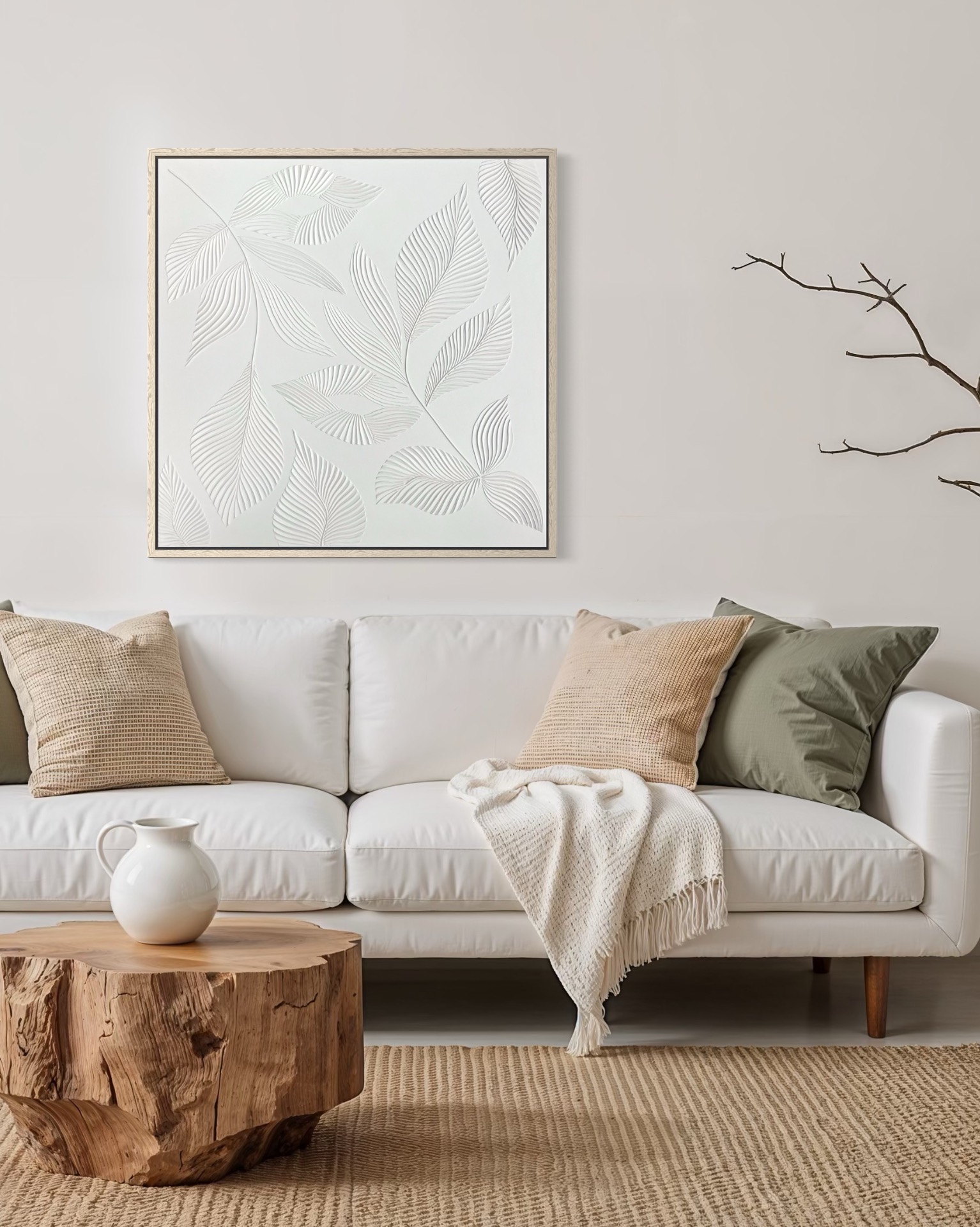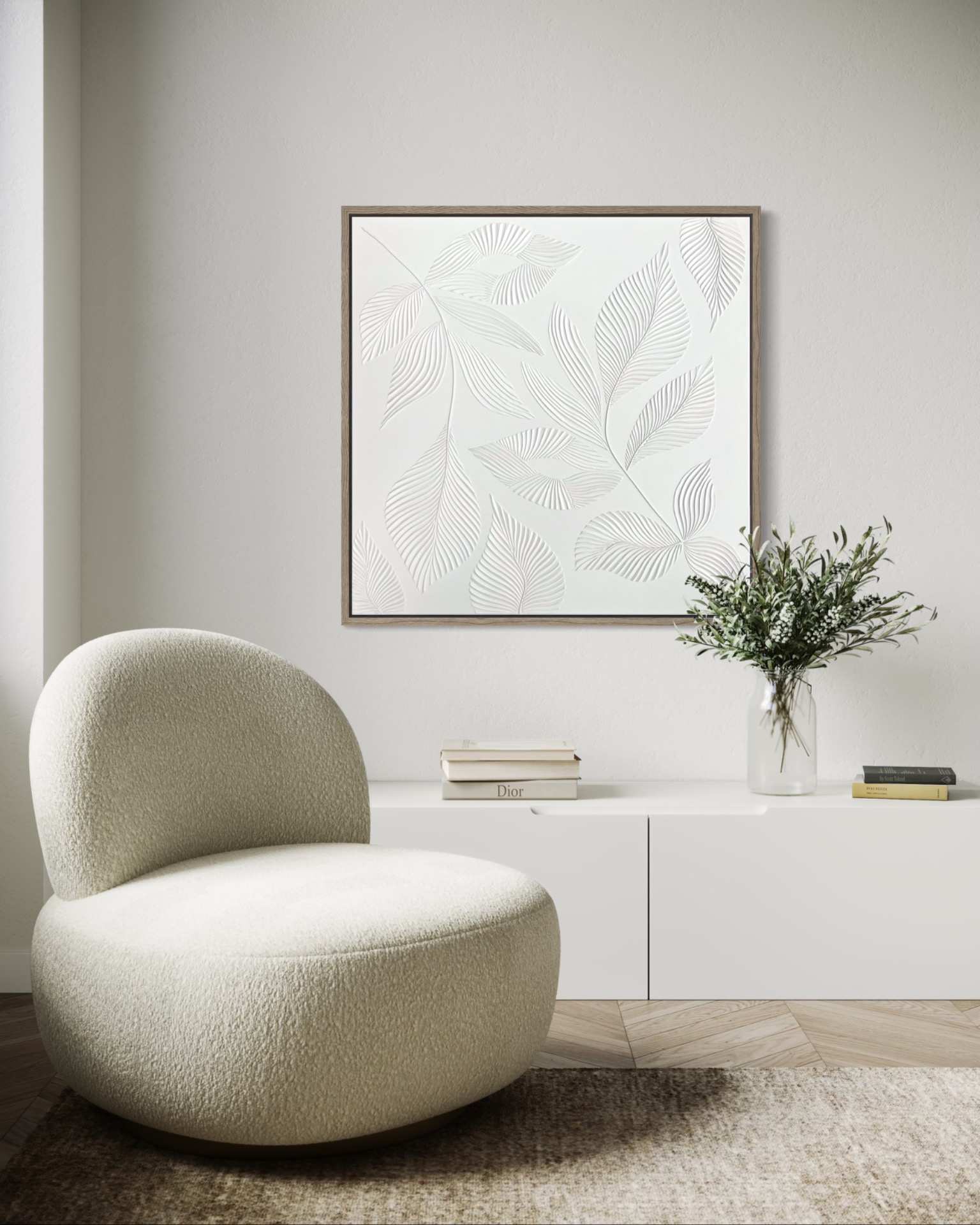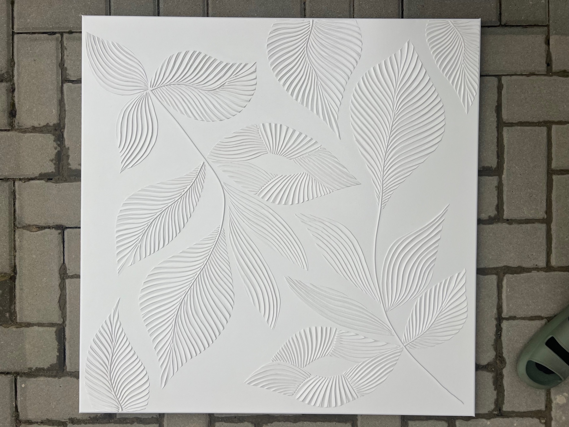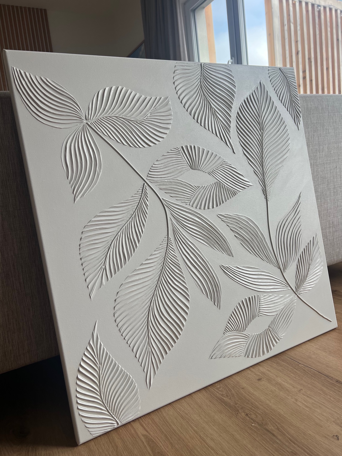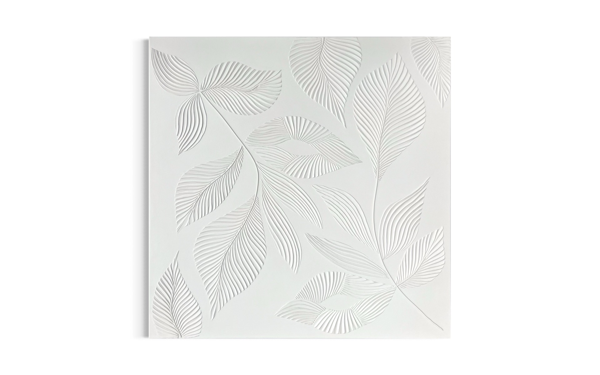 Minimalistické reliéfní dílo s motivem listů. Jemné linie a přírodní struktura v kombinaci s dopadajícím sluncem dodávají obrazu hloubku a dynamiku.